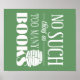 This design reads "No such thing as too many books" in a variety of fonts/typography. It's accompanied with an illustration of a pile of books weighing down the letters.