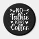 Funny coffee design for the person who loves their coffee in peace, features white text and hearts that reads NO Talkie Before Coffee! Coffee themed bags, mugs, stickers, buttons, magnets and more.