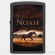 A brown horse gallops across a field at sunset, with the name Noah carved above.