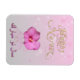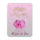 Noble, elegant Persian New Year illustration: A pink hibiscus bloom with New Year wishes in english and farsi on a bokeh background.