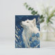 This ethereal postcard features a majestic white wolf in profile, gazing toward a star-studded midnight sky. The artwork is characterized by intricate, flowing linework within the wolf's fur, set against a deep indigo background with a cracked marble texture. Vibrant blue blossoms and tall, golden wheat-like stalks frame the wolf, creating a serene and mystical atmosphere. The rich palette of navy, cerulean, and cream provides a sophisticated, artistic vibe. As a postcard, it is perfect for sending a soulful message or as a unique piece of miniature wall art for nature and wildlife enthusiasts.