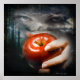 Nocturne features a dark forest, alluring eyes, and a bright red apple held in a woman's hand.
