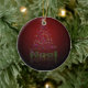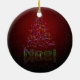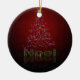 Sparkling Christmas tree on a dark maroon background with noel in text reflecting in the background.