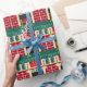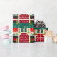 Image printed on wrapping paper is from a photo of an original tapestry crochet creation designed handmade and Copyright © by published designer Delores Chamblin. The picture of a section of the unique handcrafted brick fireplace red gold green and white Christmas wall hanging is reproduced on the wrapping paper.