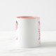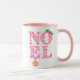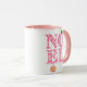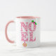 Mug in the greeting "Noel" patterned with retro modern Christmas trees in shades of soft pink, embellished with a holly sprig and a Christmas ornament