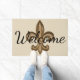 Pretty welcome in script doormat with a large gold fleur de lis symbol.
