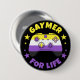 Another fun gamer badge by JessicaAmber. This pin features a video game controller filled with the stripes of the nonbinary pride flag: yellow, white, purple and black. You can also change the colours yourself by uploading a photo. Around the border is the slogan 'Gaymer For Life', which you can also edit. Great gift for your enby partner or best friend.