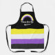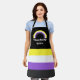 Medium-sized apron with an image of a non-binary pride flag and a rainbow; yellow, white, purple, and black design on a black background, with a customizable text template for your own name or message