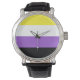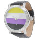 Non-binary people may identify as having two or more genders; having no gender; moving between genders or having a fluctuating gender identity; or being third gender or other-gendered, a category that includes those who do not place a name to their gender. Each stripe color represents different types of non-binary identities: Yellow for people who identify outside of the gender binary, white for nonbinary people with multiple genders, purple for those with a mixture of both male and female genders, and black for agender individuals.