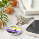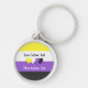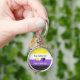 Premium keychain with the non-binary pride flag with little hearts in the center of the design. Black, purple, white, and yellow flag of the enby pride movement; with an editable text field for your name or message