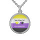 Silver necklace with the non-binary pride flag with little hearts in the center of the design. Black, purple, white, and yellow flag of the enby pride movement; with an editable text field for your name or message