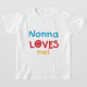 Nonna Loves Me T-shirts, bodysuits, cards, bags, and other gear with a blue, red, and yellow text design.