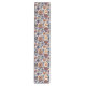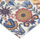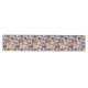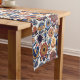 This colorful table runner is bursting with color! Tones of blue, cinnamon brown, and gold are predominant in boho style flowers of many varieties. Everything is placed on a white background. Unique and colorful!