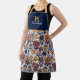 The bottom portion of this unique apron features a pattern of boho style flowers in tones of blue, cinnamon brown, and gold. The pattern is placed on a white background. The top portion is solid matching dark blue, with your monogram in gold and your name in light blue.