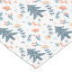This pretty Christmas table runner is covered with scandinavian style Holiday trees, leaves, and flowers. Colors used in the pattern include blue gray and coral orange on a white background.