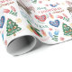 This pretty Holiday wrapping paper is covered with scandinavian style images, including a reindeer, pattern hearts, a Holiday tree, flowers, snowflakes, and more. Colors include red, green, gold, blue and brown. Everything is placed on a white background. The stylized text says "Merry Christmas" and "Happy New Year". Unique and festive!