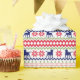 The repeated pattern on this colorful Christmas Nordic sweater style gift wrapping paper is a silhouette Labrador Retriever Dog among snowflakes, trees, and geometric designs. Colors include navy blue, bright Holiday green, and red, all on a white background.