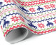 The repeated pattern on this colorful Christmas Nordic sweater style gift wrapping paper is a silhouette cowboy riding a bucking horse among snowflakes , trees, and geometric designs. Colors include navy blue, bright Holiday green, and red, all on a white background.