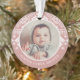 Festive Christmas photo ornament features a favorite photo on each side, encircled by a holiday sweater pattern in mauve pink and white. Personalize with your custom caption; shown with "baby's first Christmas" on one side and your little one's name and the year on the reverse. Perfect for treasured newborn photos or Christmas pictures of your sweet babe!