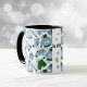 Winter theme coffee mug with a cute Nordic style pattern of thick sweaters, hats, mittens, socks and Scandinavian snowflakes in shades of blue with green accents. Personalize the name in the easy Zazzle "Personalize" button.