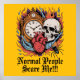Celebrate your unique, beautifully weird side with this striking gothic illustration. A skeletal skull, realistic heart, and ornate clock are wrapped in flames, framed by bold gothic typography that reads “Normal People Scare Me!!!”