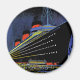 Vintage ocean liner poster for French Line's Normandie at harbour ablaze with light.