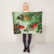 A pair of male and female northern red cardinals perch in a holly tree while a third cardinal sits on a woven wooden basket filled with freshly picked holly leaves and berries. Image created from an original oil painting by Crista Forest.