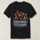 My 11 yo wore adult XL (5’7” 165#). The 8yo is small framed. She wore adult small and tied it in the back. Grandma wore adult large with long sleeve shirt underneath. Tall girl adult medium. Dark haired male adult large. Good quality dark Heather gray, Gildan brand shirt. -it was next up from basic choice and cost about $20 per shirt. Not too thick or thin. Washed and dried well, no major shrinkage. Not see-through. Can wear a bra under it fine. Screen print is just as shown and well done, front and back.