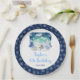 This cute and whimsical watercolor birthday plate features a watercolor winter wonderland scene with adorable arctic animals, such as a polar bear, penguin, cat, owl, seal and a moose. In the background are the northern lights, snow capped mountains and trees. The text combines handwritten script and sans serif fonts for a stylish and modern look. Falling snowflakes and beautiful blue floral arrangements give a winter feel. This is perfect for winter and Christmas baby showers.