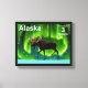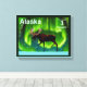 This is one of a series of postage stamps of an imaginary independent Alaska. An ever so slightly stylized image of a moose (Alces alces) silhouetted against the green and glowing Northern Lights. Text reading "Alaska" and "Postage 3 Nuggets" also appears.
