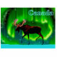 An ever so slightly stylized image of a moose silhouetted against the Northern Lights. Text reading "Canada" appears in glowing blue and white.