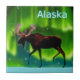 An ever so slightly stylized image of a moose silhouetted against the Northern Lights. Text reading "Alaska" appears in glowing blue and white.
