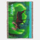 An ever so slightly stylized image of a moose silhouetted against the Northern Lights. Text reading “Alaska” appears in glowing blue and white.