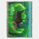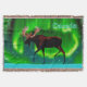 An ever so slightly stylized image of a moose silhouetted against the Northern Lights. Text reading “Canada” appears in glowing blue.