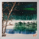 A painting of Northern Lights and an icy pond.