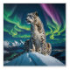“Northern Sky Wanderer” – Snow Leopard Portrait. Against a sky streaked with dancing auroras, a snow leopard sits in quiet command atop a frozen summit. Though it belongs to southern mountains, here it becomes an otherworldly wanderer, impossibly at home in the shimmering night. The crisp air, glowing stars, and distant village lights merge into an enchanting tableau of wildness and mystery.