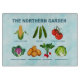 A humorous take on gardening in places with cold climates such as Alaska, Minnesota and Canada. You can't grow everything, but try those illustrated here: Yukon Chief sweet corn, snow peas, Yukon Chief tomato, January King cabbage, Yukon Gold potato, Icicle radish, and Iceberg lettuce. Each is labeled and text reading, "THE NORTHERN GARDEN" also appears. Everything is superimposed on a snowy background image.