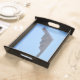 This is a well made, sturdy wooden tray with a flawless black finish and lovely map on the tray surface. It is both vintage & modern at the same time. Looks exactly like the photo; does not disappoint. So nice to find something of quality individually made and not the mass-produced 'shabby chic' merchandise seen in stores. I am so pleased to be able to give this to my college-age niece for her birthday. This can be used as a tray to hold jewelry or toiletries, or hung on the wall as art. The map surface is sealed (it is slightly shiny) so would be moisture resistant. It is well worth the asking price but I was able to apply a sale code as well. Very happy with my purchase. Map is crisp & clear and sealed with a water-resitant finish.