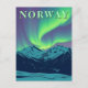 A striking postcard of Norway featuring the Aurora Borealis over snow-capped mountains. A vibrant travel art design that captures the beauty of the Northern Lights.