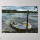 Serene lakeside Scene. The foreground features two charming rowboats gently bobbing on the calm waters of a pristine lake.