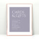 A thoughtful and cheery wedding sign for cards and gifts with bold retro typography in white on a bright yellow background with a little poem that says "Thank you for the gifts, so kind and true