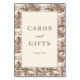This wedding tabletop sign features a vintage-inspired design with an intricate repeating pattern of trees and quaint houses in a sepia tone, creating a warm and nostalgic atmosphere. The central blank space is framed by a double border, allowing for customizable text, while the phrase "CARDS and GIFTS" is elegantly displayed in a mix of serif and cursive fonts, followed by "THANK YOU" in a simple serif style. The muted earth tones and detailed woodcut-style illustrations evoke a classic landscape aesthetic, perfect for expressing gratitude at your special event.