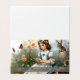 A young girl in a blue dress with white ruffles sits on a wooden bench in the middle of a flowering garden. She is reading a small card while butterflies fly around her. A hare and a small rabbit sit next to her, while other spring flowers bloom in warm colors in the background. The words "Happy Easter" give the picture a festive touch.