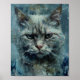 Hyper-realistic cat portrait in a painterly style with expressive brushstrokes. Urban night scene with a melancholic atmosphere, captured in a close-up view. Cool-toned color palette with muted blues, greens, and subtle hints of warm colors for contrast. The painting features a textured, almost rough finish, with visible brushstrokes Emphasizes the intricate details while allowing areas of abstraction in the background to create a dynamic, contemporary feel.