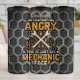 This graphic features a humorous phrase for mechanics: "I AM NOT ANGRY THIS IS JUST MY MECHANIC FACE". It's set against a dark, industrial background of hexagonal mesh. The text is stylized in orange and white, with crossed wrenches and gears, creating a bold and relatable design for automotive professionals or enthusiasts.