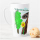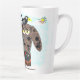This latte mug is for laughs and fun, it's about a brown spotted cartoon dog who claims not to be bored on a warm summer day, instead the dog is getting creative. The dog is brown with black spots and has a large black nose it is summer time so the sun is shining brightly flowers are in bloom trees are green an there even is a tiny bird sitting on the dogs head.