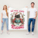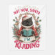 A fun and cheerful Christmas holiday design showcases a black cat dressed in a red cape and a white turtleneck sweater, engrossed in reading a book. The cat sits in front of fern and holly branches, under a golden arch adorned with bells. The colorful text reads, "Not now Santa, I'm reading." This design is available on various products that make perfect gifts for book lovers.