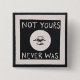 Ink pen sketch of lips and the phrase "Not yours / Never was" printed on a button