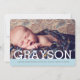 Thoroughly modern and simply elegant, this design is a perfect way to introduce your sweet little boy. Features his first name in bold white typography with so baby blue accent. Two large photos of your baby - one on the front and one on the back. The front also holds baby's birth information, and on the back a special text area to be personalized with parents and family info. A lovely modern introduction of your baby boy to family and friends.