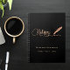 A chic black background, decorated with a feather pen. Personalize and add a name and title. Golden text: Notary